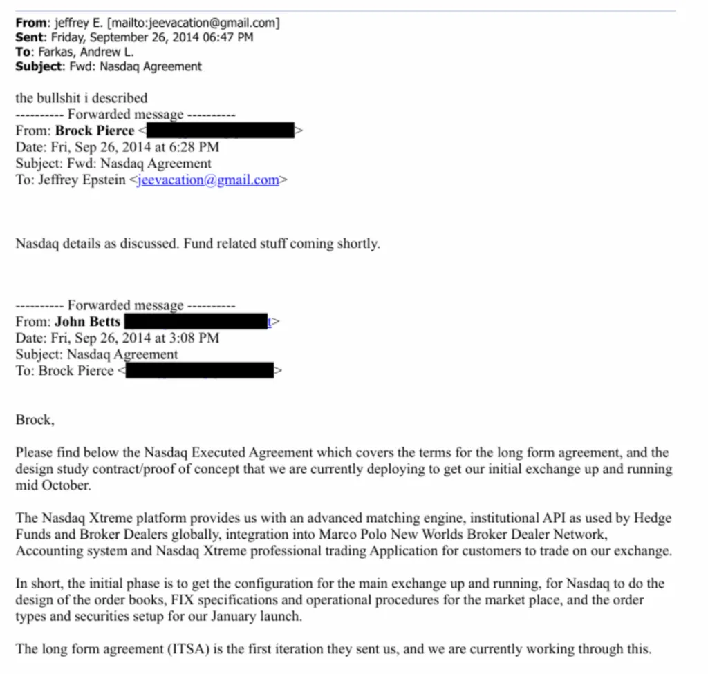 By 2014, Epstein was partnering with Pierce on investments and assisting him with his business affairs. For example, Epstein looked over a Noble Bank/Markets Nasdaq agreement — the Puerto Rico-based international financial entity started by Pierce and John Betts that briefly served as the main “bank” for the stablecoin Tether.