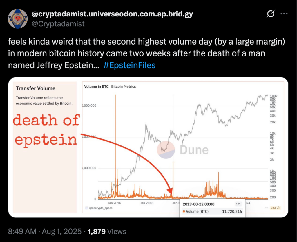 Epstein’s death rocked crypto markets, and a few days after there was a transfer of a quarter of a trillion dollars on a single day.